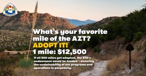 The Arizona Trail Association Endowment Fund is a lasting investment in the future of Arizona’s iconic 800-mile trail ensuring it remains thriving for generations to come. This permanent fund provides stable, reliable support for essential trail stewardship, from maintenance and restoration to youth education and volunteer engagement, no matter what challenges the future brings. By contributing to the Endowment, you can leave a Trailblazing Legacy that endures beyond a single season or project. A gift of $12,500 or more funds one mile of the Arizona Trail in perpetuity, creating a powerful, tangible way to honor your love for the trail, celebrate a milestone, or memorialize someone special.