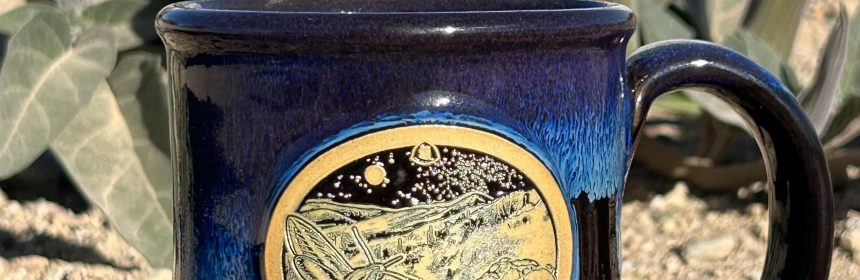 This year’s commemorative mug features a scene from an unnamed canyon on the Tonto National Forest within a unique landscape that marks the transition zone from Upper Sonoran Desert to chaparral, where interesting plants and animals flourish. If you’re here after the monsoon season you will see bright white flowers blooming from the sacred datura (Datura wrightii), also called moon lily or jimsonweed. The sweet fragrance of these flowers – which only bloom for one or two nights before they shrivel and fade – make nocturnal outings on the Arizona Trail a special experience. When you spend a few minutes admiring these flowers you’re likely to share the space with sphinx moths (Manduca sexta). These giant insects are as large as hummingbirds, and drink sweet nectar from deep within the flowers. The mug‘s glaze is inspired by the beauty and mystery of nighttime on the trail. May it inspire you to explore all of the Arizona Trail’s passages – illuminated by the sun, moon and stars – with the knowledge you are helping to protect, maintain and improve this treasured 800-mile resource.